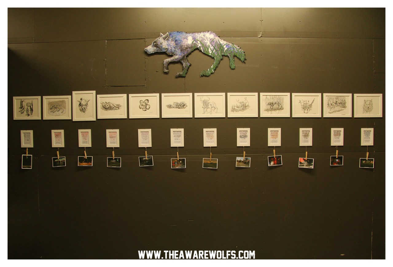 We asked Kai Martin to draw wolves depicting the 12 different meanings of the fullmoon. On the wall, you’ll see Kai’s original artwork. Below his art is how we used his art to make the flyer for that month’s FMBR along with the meaning of that full moon. And at the very bottom is one photo from that FMBR.