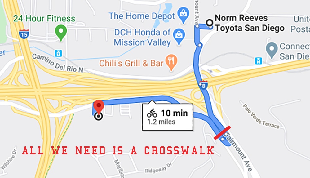 This issue is near and dear to the author because I commute from Hillcrest to Norm Reeves Toyota of San Diego and I believe myself and others would utilize the new SR15 Commuter Bikeway if there were a safe and legal way to cross at Fairmont Ave.
