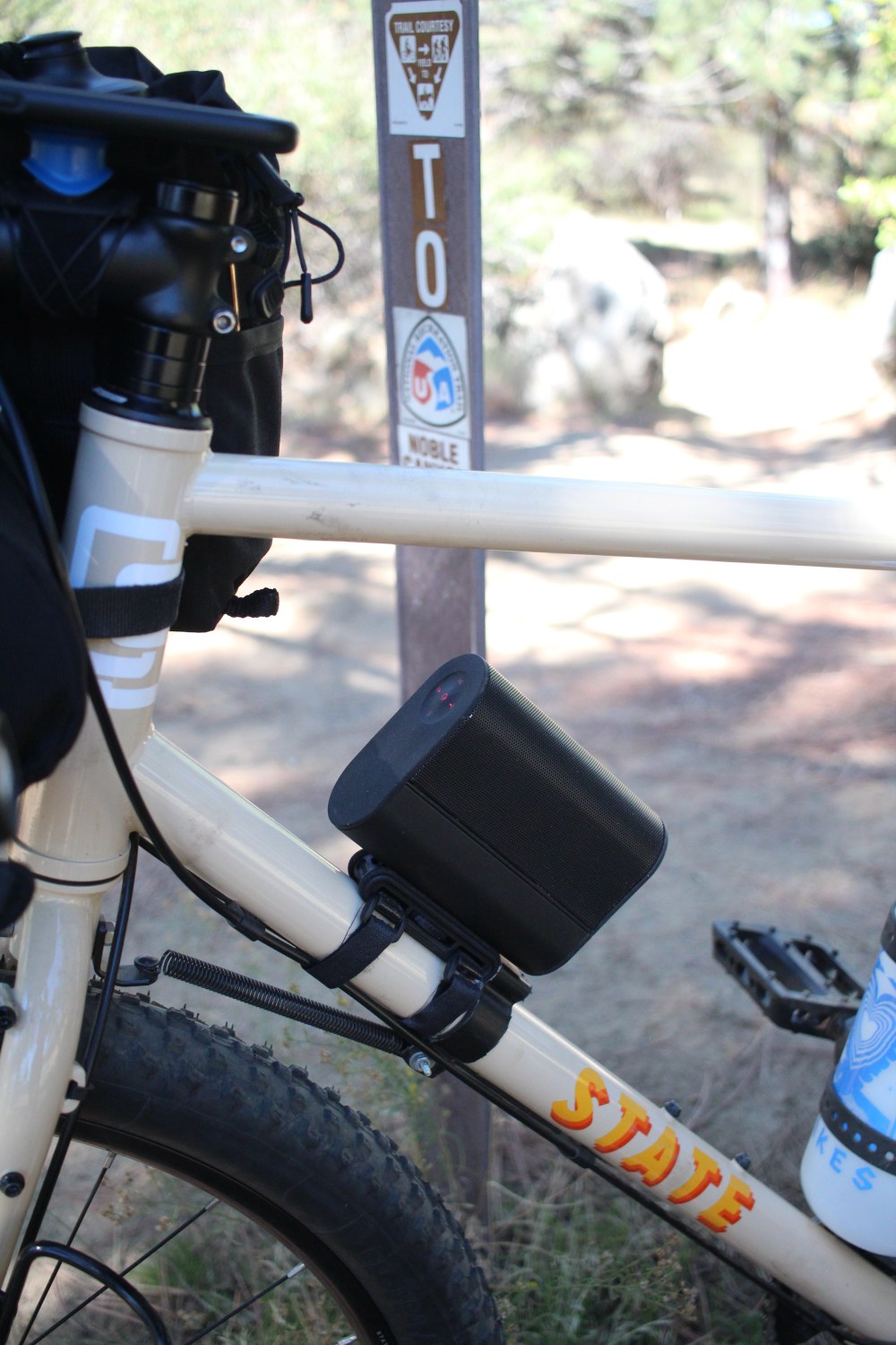 The Knog PWR Sound speaker packs a perfect punch. The sound is great and can get really loud! It comes with a mount that I honestly didn’t think would hold up on the trails but after a few rides and some gnarly terrain, the mount proved to be super sturdy and didn’t even hardly rotate much while on the bike. I also really like this mount because I can mount it to the awning on my car which keeps the speaker out of the way, out of the dirt, or off the table. It runs off the 3350mah Knog PWR Bank Small which can be removed to charge your electronics or power the Knog PWR Lantern –