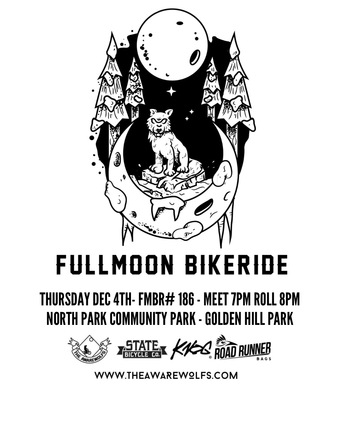 Since 2010, The Awarewolfs’ Fullmoon Bikerides, or AWLF FMBRs for short, are group bicycle rides that take place – you guessed it – every full moon! FMBRs are a great way to stay in tune with the lunar calendar and consistent occurrence that gets you off your couch to ride your bike. On the FMBR, we urge everyone to obey the rules of the road and be as aware as possible. “Anyone and anybike” is welcome but, a fixed gear, road bike, ten speed, or mountain bike is the best to keep up. If you’re riding an E Bike – please be extra aware of fellow riders and lower your speed.